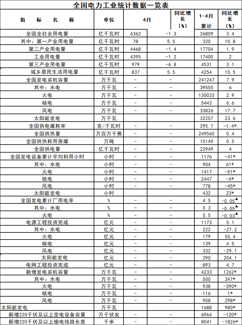 注:1.全社会用电量为全口径数据,全国供电量为调度口径数据。2.“同比增长”列中,标*的指标为绝对量;标▲的指标为百分点。