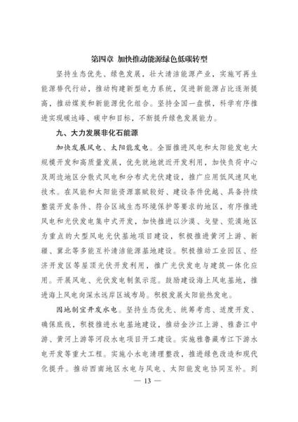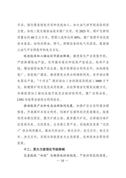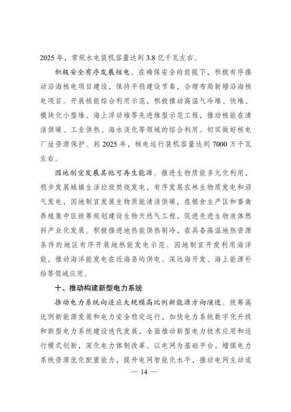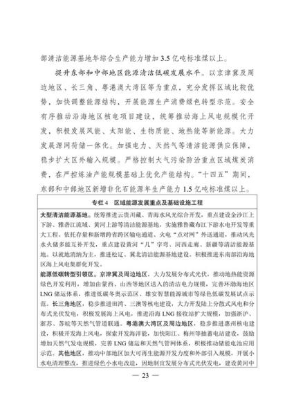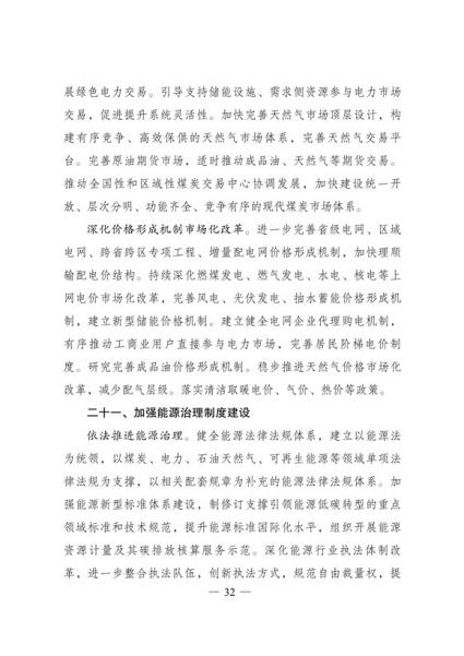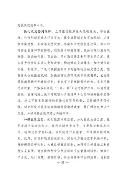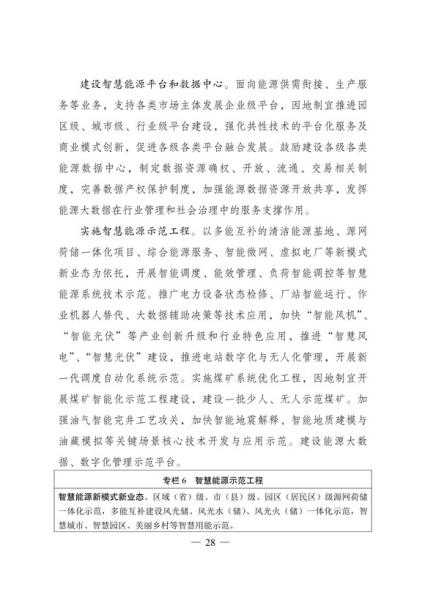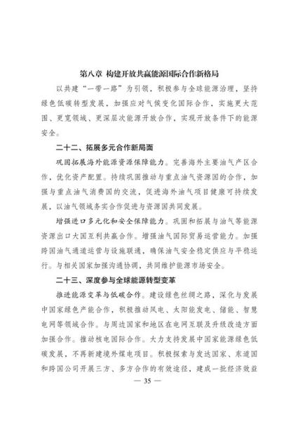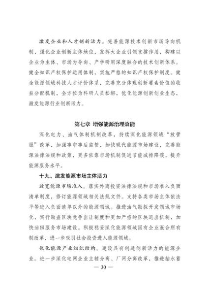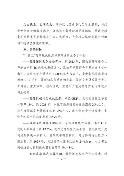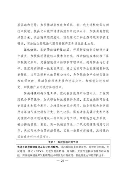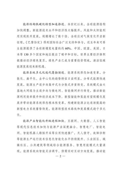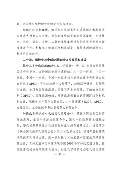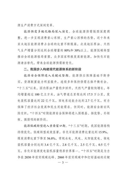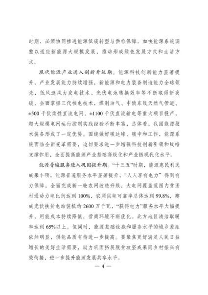 文件表示,我国步入构建现代能源体系的新阶段。现代能源产业进入创新升级期。能源科技创新能力显著提升,产业发展能力持续增强,新能源和电力装备制造能力全球领先,低风速风力发电 技术、光伏电池转换效率等不断取得新突破,全面掌握三代核电技术,煤制油气、中俄东线天然气管道、±500千伏柔性直流电网、±1100千伏直流输电等重大项目投产,超大规模电网运行控制实践经验不断丰富,总体看,我国能源技术装备形成了一定优势。围绕做好碳达峰、碳中和工作,能源系统面临全新变革需要,迫切要求进一步增强科技创新引领和战略支撑作用,全面提高能源产业基础高级化和产业链现代化水平。