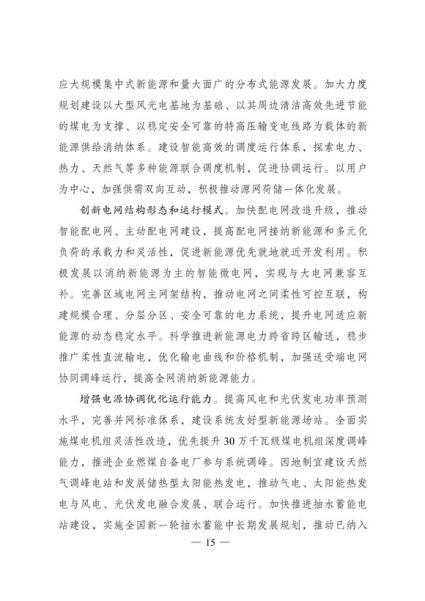 推动构建新型电力系统。推动电力系统向适应大规模高比例新能源方向演进。统筹高比例新能源发展和电力安全稳定运行,加快电力系统数字化升级和新型电力系统建设迭代发展,全面推动新型电力技术应用和运行模式创新,深化电力体制改革。以电网为基础平台,增强电力系统资源优化配置能力,提升电网智能化水平,推动电网主动适应大规模集中式新能源和量大面广的分布式能源发展。加大力度规划建设以大型风光电基地为基础、以其周边清洁高效先进节能的煤电为支撑、以稳定安全可靠的特高压输变电线路为载体的新能源供给消纳体系。建设智能高效的调度运行体系,探索电力、热力、天然气等多种能源联合调度机制,促进协调运行。以用户为中心,加强供需双向互动,积极推动源网荷储一体化发展。