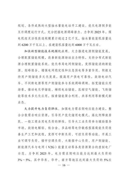 大力提升电力负荷弹性。加强电力需求侧响应能力建设,整合分散需求响应资源,引导用户优化储用电模式,高比例释放居民、一般工商业用电负荷的弹性。引导大工业负荷参与辅助服务市场,鼓励电解铝、铁合金、多晶硅等电价敏感型高载能负荷改善生产工艺和流程,发挥可中断负荷、可控负荷等功能。开展工业可调节负荷、楼宇空调负荷、大数据中心负荷、用户侧储能、新能源汽车与电网(V2G)能量互动等各类资源聚合的虚拟电厂示范。力争到2025年,电力需求侧响应能力达到最大负荷的3%~5%,其中华东、华中、南方等地区达到最大负荷的5%左右。