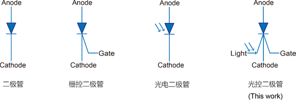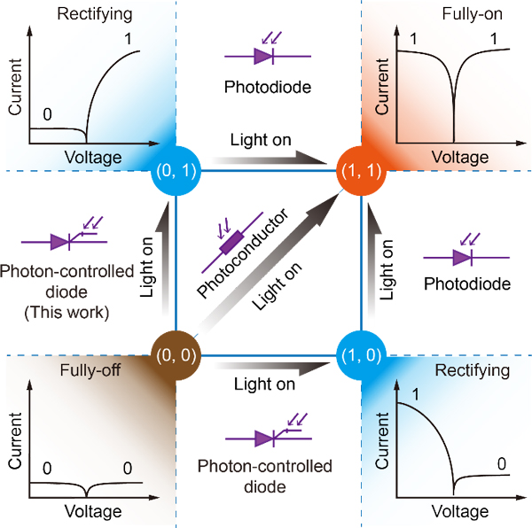 光电探测器是一类通过电信号探测光信号的重要半导体器件,包括光电二极管、光电晶体管和光电导等。尽管种类繁多,但光电探测器的信号状态在光照前后可归纳为全关态(0,0)、全开态(1,1)以及整流态(0,1)或(1,0)三类(图2)。已往的光电探测器可以实现两种状态的相互转换,以光电二极管为代表的器件实现由整流态向全开态转换,以及以光电导和光电晶体管为代表的器件实现由全关态向全开态转换。从图中的电学行为的完备性出发,理论上应存在一类由全关态向整流态转换的新型器件。