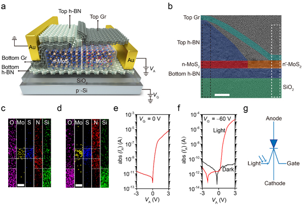 图3. 二硫化钼光控二极管。a. 器件结构示意图;b. 局部截面TEM图像;c. 图b白色虚线区域元素分布图;d. 图b黑色虚线区域元素分布图;e. IA-VA特性(VG = 0 V);f. 在暗态和光照下的IA-VA特性(VG = -60 V);g. 等效电路图。