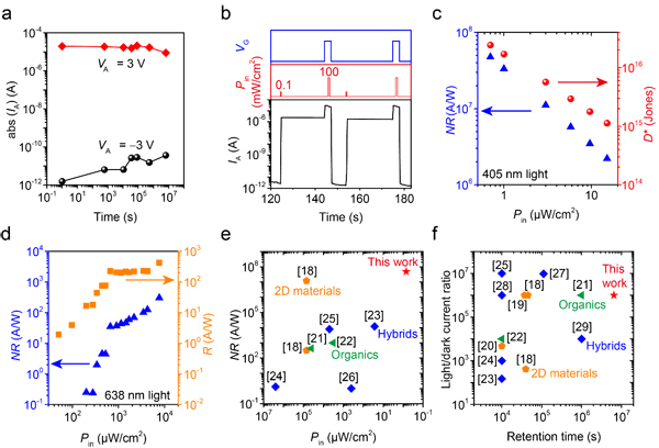 图4. 光控二极管的光电存储特性。a. 存储特性;b. 开关特性;c. 405 nm光非易失响应度和探测度;d. 638 nm光非易失响应度和响应度;e-f. 基于不同材料体系的器件性能对比。