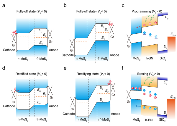 图5. 工作机制。a. 全关态(VA > 0);b. 全关态(VA < 0);c. 数据写入过程;d. 整流态(VA > 0);e. 整流态(VA < 0);f. 数据擦除过程。