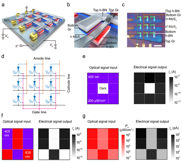 通过器件能带结构的分析,研究人员阐明了器件的工作原理。光控二极管本质上是由位于正和负极的两个石墨烯/二硫化钼肖特基结和位于沟道的二硫化钼n/n-结串联而成。在负栅压下,处于截止态的肖特基结将使器件处于全关态;在光照时,氮化硼光栅层将捕获光生载流子,从而屏蔽栅压的调控作用,使肖特基结处于导通态,进而使得二硫化钼n/n-结的整流特性得以呈现,器件处于整流态(图5)。研究人员进一步设计构筑了3×3像素的光电存储阵列,首次在无选通器件的条件下展现了优异的抗串扰能力;同时,基于器件对不同波长和强度光信号响应的差异,研究人员演示了阵列对光信号的探测及处理功能,表明了光控二极管具有实现高集成度、低功耗和智能化光电系统的极大潜力(图6)。