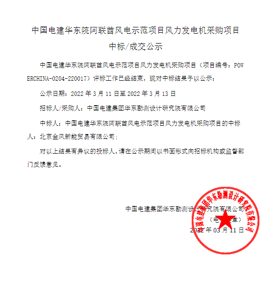 北极星风力发电网讯 :3月11日,中国电建华东院阿联酋风电示范项目风力发电机采购项目入围公示,金风科技 预中标,规模共计103.5MW,将提供23台GW155-4.5MW机型。