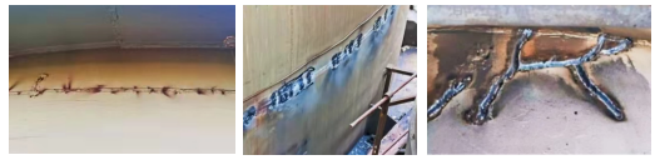 这三张图是我国另一座高压超高风温顶燃式热风炉预燃室炉壳焊缝两边母材脆裂、开裂现场状况。产生这种缺陷的该热风炉炉壳材质就是传统的具有爆炸隐患的Q345C。