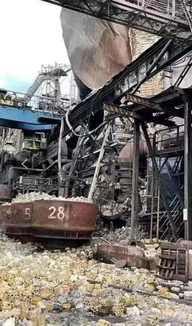 图2 捷克一钢厂2000m3高炉顶燃式热风炉于2021年12月初发生的惊天炉体大爆炸安全事故,炉壳炸开一个面积约100m2~150m2的大洞,热风炉蓄热室数百吨1000多℃高温大墙砖和格子砖被炸出体外。