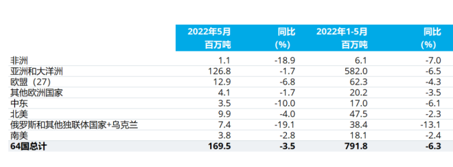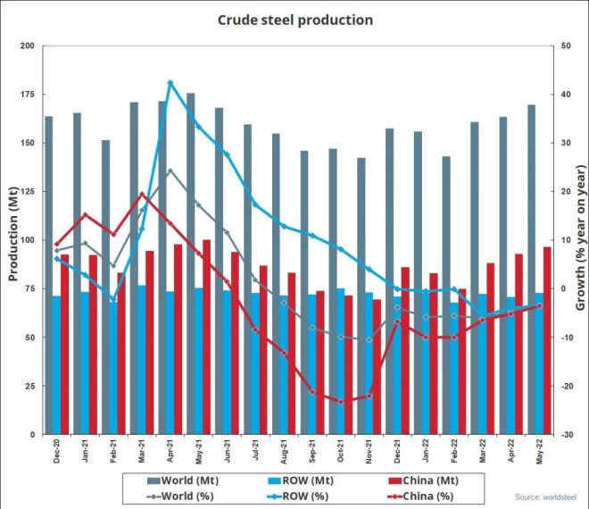 2022年5月全球64个纳入世界钢铁协会统计国家的粗钢产量为1.695亿吨,同比下降3.5%。