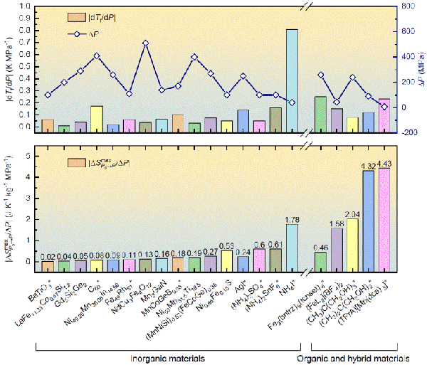 图2. 各类压卡材料的性能对比,包括相变温度的压力敏感性、饱和压力和单位压力导致的熵变