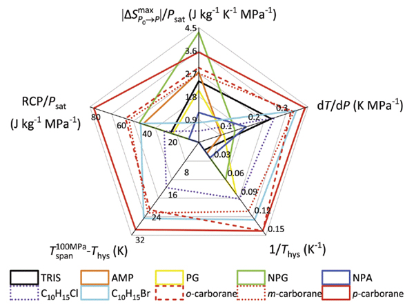 图1. 碳硼烷体系与主要有机塑晶压卡材料的性能对比雷达图