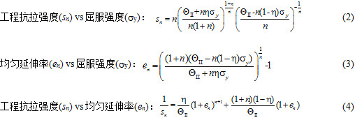 图2 ESH模型的应用:(a)建立"屈服强度-抗拉强度-均匀延伸率"之间定量关系;(b)实现拉伸性能及拉伸应力-应变曲线定量预测