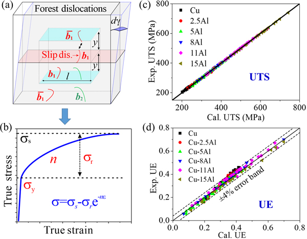 为第二阶段硬化率,对同一金属合金体系为常数。该ESH模型得到了6种合金成分、100余种不同微观组织状态单相铜铝合金的实验验证,如图1所示。
