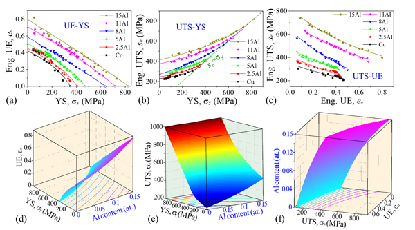 该ESH模型阐明了单相金属材料形变过程中一些重要规律:1)用一个参数(n)统一了五阶段加工硬化规律;2)揭示了极限强度、临界强度、真抗拉强度与成分及变形机制之间关系;3)首次推导出"屈服强度-抗拉强度-均匀延伸率"之间定量关系(公式(2-4),图2a-2c);4)定量揭示了拉伸强度-塑性同步提升的两个基本原则,即成分优化(提升位错滑移平面性)与组织优化(降低初始高能缺陷),在铜合金、镍基合金、TWIP钢、高氮钢、316L不锈钢等单相合金中均得到了系统性实验验证;5)实现了单相铜铝合金拉伸强度、塑性及拉伸应力-应变曲线的定量预测,如图2d-2f所示:
