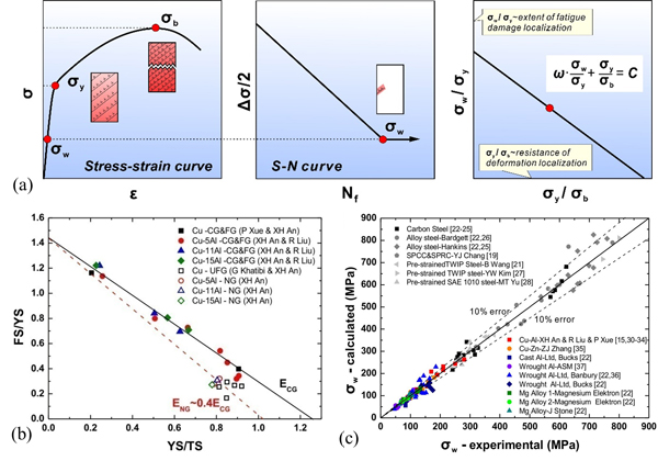 为了建立金属结构材料拉伸性能与疲劳性能之间定量关系,该团队成员刘睿博士在对铜铝单相合金拉伸性能与高周疲劳强度系统性研究的基础上,从疲劳损伤过程弹性变形与应变局部化两方面入手,通过引入合金成分、微观组织与宏观缺陷参数,建立了金属结构材料高周疲劳强度预测模型: