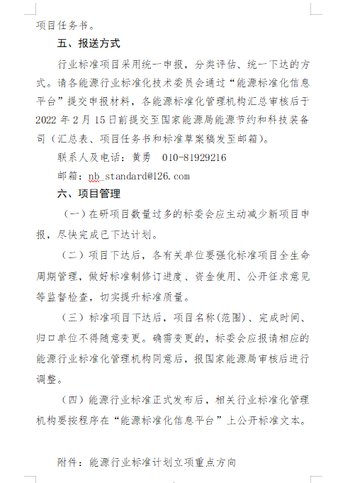 按照国家能源局标准化工作安排,为明确2022年能源行业标准立项重点方向,我们组织编制了《2022年能源行业标准计划立项指南》。现印发给你们,请按照指南明确的要求,做好2022年能源行业标准计划立项工作。
