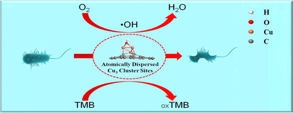 图4. 亚纳米尺度下Cu3金属团簇活性中心结构与抗菌性能示意图