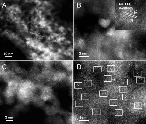 图1. (A),(B) Cu纳米粒子(Cu-NPs/ND@G) 的球差电镜表征;(C),(D) 亚纳米尺度Cu3金属团簇(Cu 3 /ND@G )的球差电镜表征。