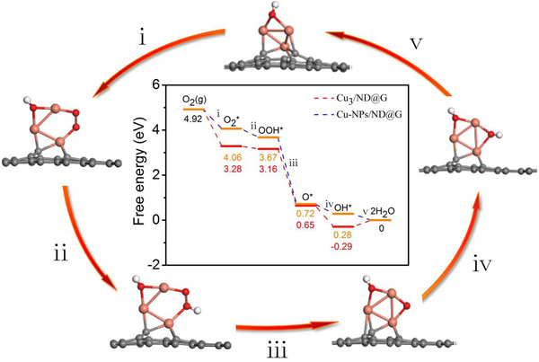 图2. Cu3/ND@G各种中间体沿模拟氧化酶反应路径的优化吸附构型和Cu3/ND@G、Cu-NPs/ND@G 模拟氧化酶机理的自由能图。灰色、棕色、红色和白色的球分别代表C、Cu、O和H原子。