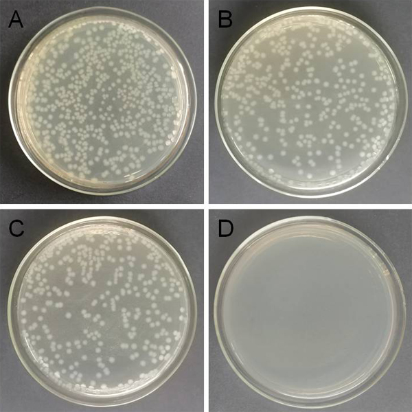 图3. 生长抑制试验:将不同的材料和大肠杆菌菌液孵育后涂在LB琼脂平板上。用(A)空白、(B) ND@G、(C) Cu-NPs/ND@G和(D) Cu 3 /ND@G 处理。培养条件:37℃和24小时